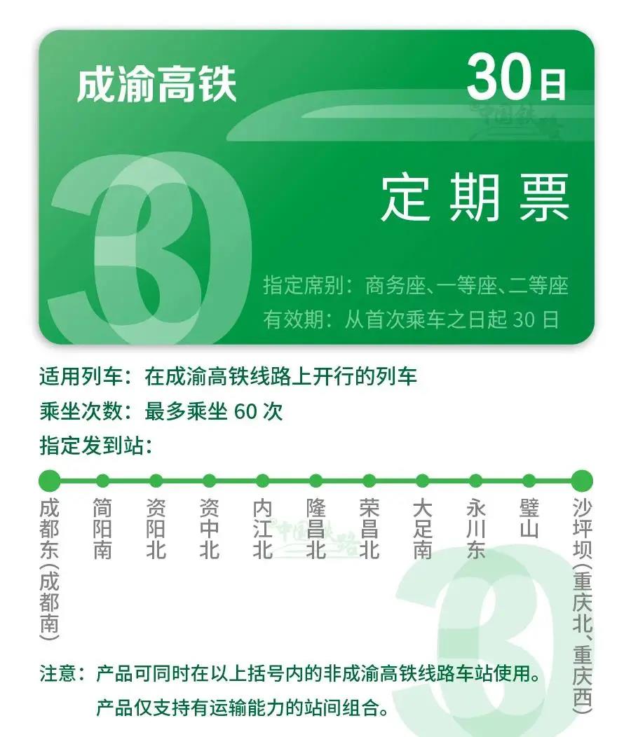 成渝高铁还推出了60次/30天的定期票,相当于月票,二等座售价6028元,平均每张票约100.5元。如果足额利用乘车次数,相较于二等座最贵的168元票价,一张票可以节省原价的40%。