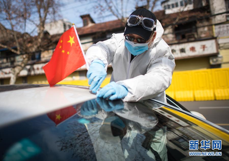 2月29日,“W大武汉紧急救援队”队员朱伟将国旗插在车上。疫情期间,由志愿者组成的“W大武汉紧急救援队”接送缺乏交通工具去医院的待产孕妇,成为即将出生的新生命的“摆渡人”。新华社记者肖艺九摄