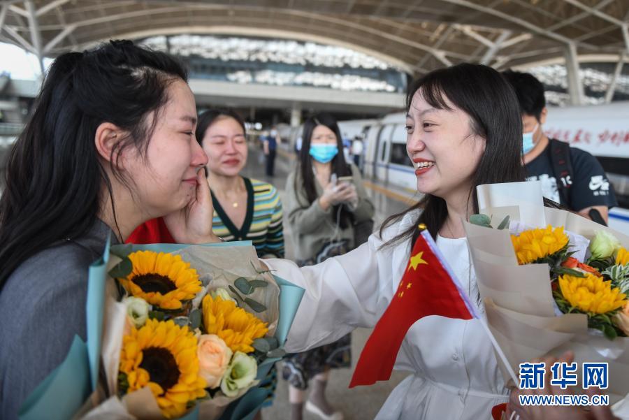 4月15日,武汉市民挥舞国旗,送别北京协和医院国家援鄂抗疫医疗队。新华社记者熊琦摄