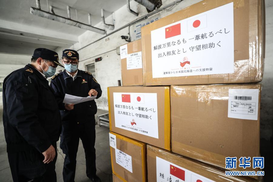 3月15日,沈阳海关工作人员检查捐赠给日本的防疫物资。当日,捐赠日本的防疫物资从沈阳发往日本,助力日本抗击疫情。新华社记者潘昱龙摄