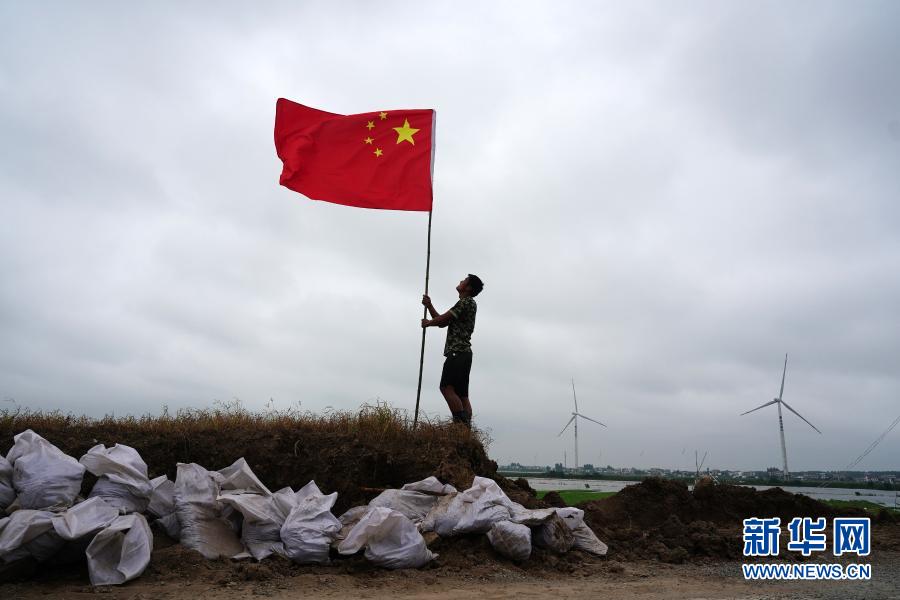 7月16日,在江西省九江市,退役军人张恒扶正防洪哨所门前的国旗。洪水来袭,曾服役于天安门国旗护卫队的张恒同父亲一起投身防汛抗洪战斗。他说,过去我护卫的是国家的荣誉和尊严,现在我守卫的是父母和家乡。新华社记者周密摄