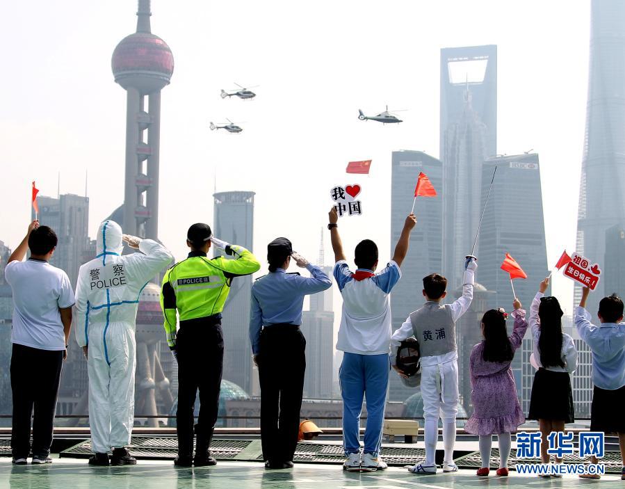 10月1日,警用直升机悬挂着五星红旗飞过上海黄浦江上空。新华社记者陈飞摄