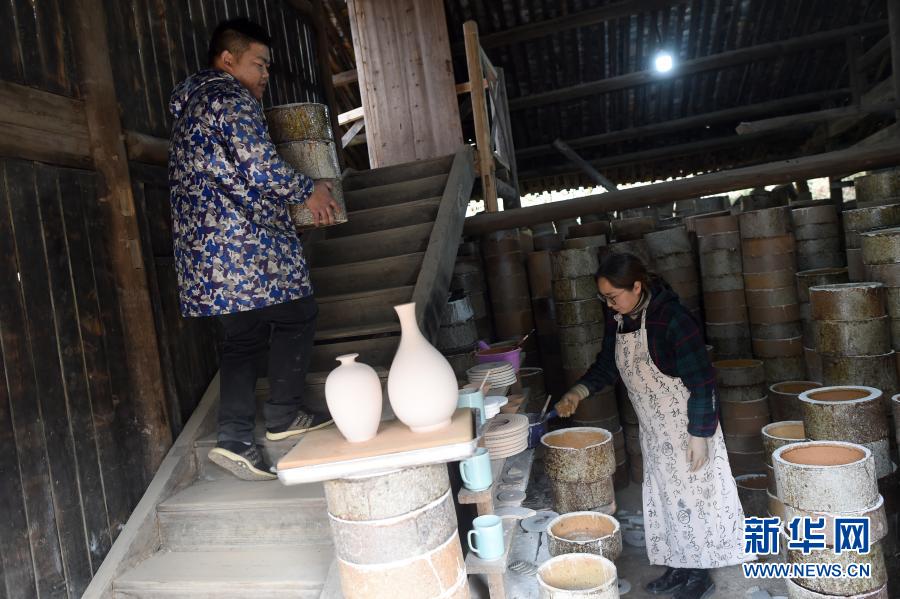烧窑师傅周鹤年(左)在陈家窑作坊搬运装有瓷胚的匣钵(12月25日摄)。新华社记者韩传号摄