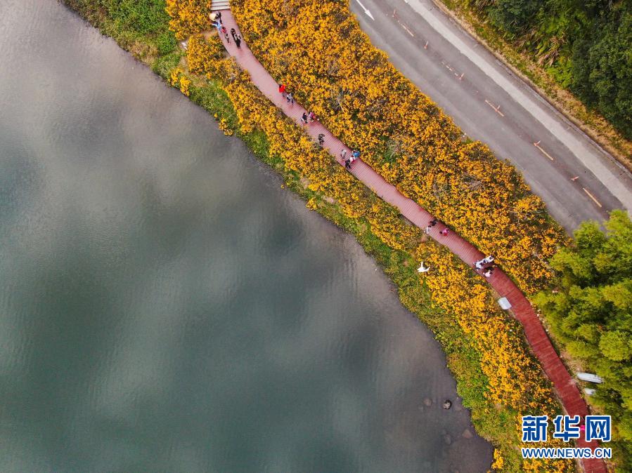 游客在广州石门国家森林公园“天池花海”游玩(12月26日摄,无人机照片)。