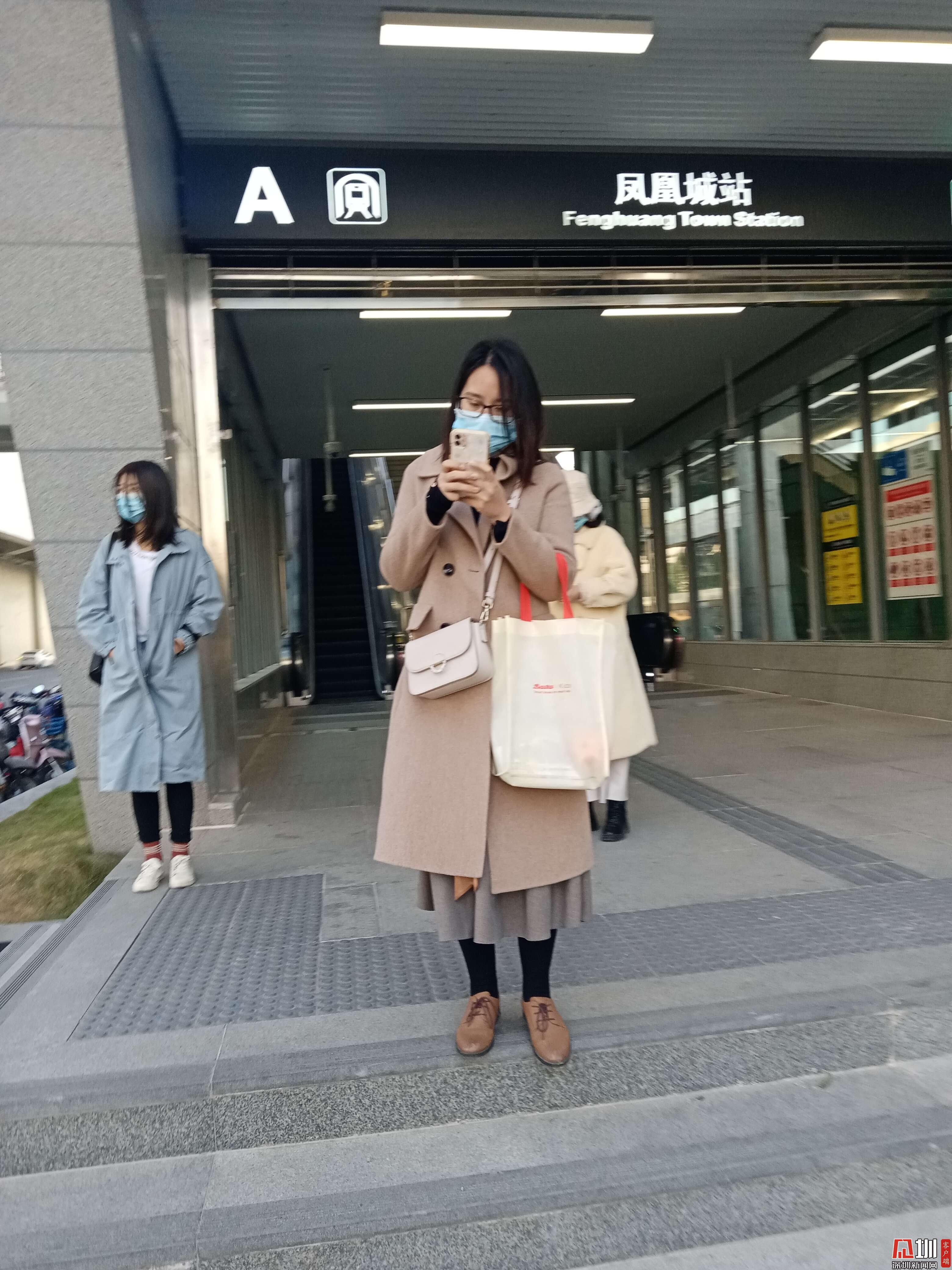 光明凤凰城地铁站,一位年轻女士身着呢子长外套。