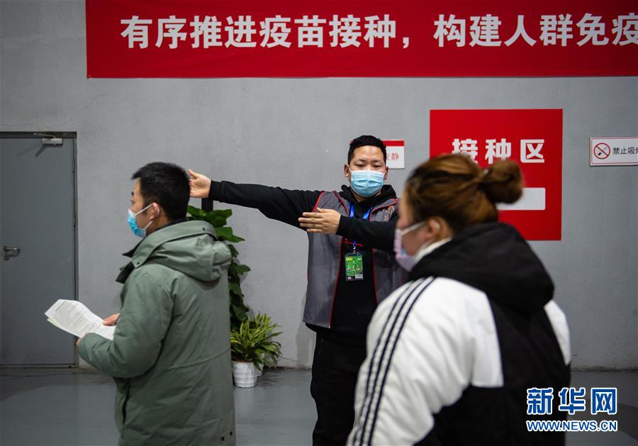 1月5日,工作人员(前右一)在登记知情区引导接种人员。新华社记者 陈钟昊 摄