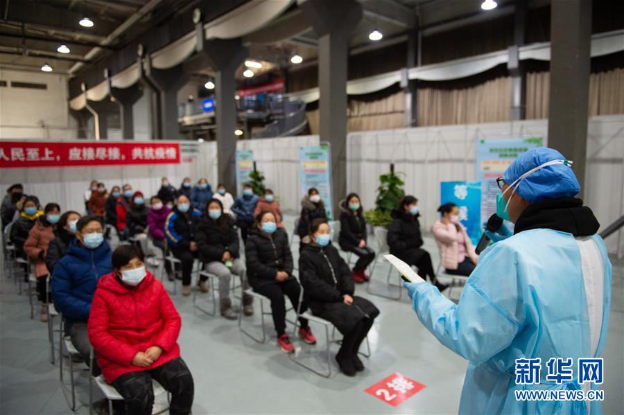 1月5日,武师傅(前)在等候区听取现场医护人员讲解疫苗接种注意事项。新华社记者 陈钟昊 摄