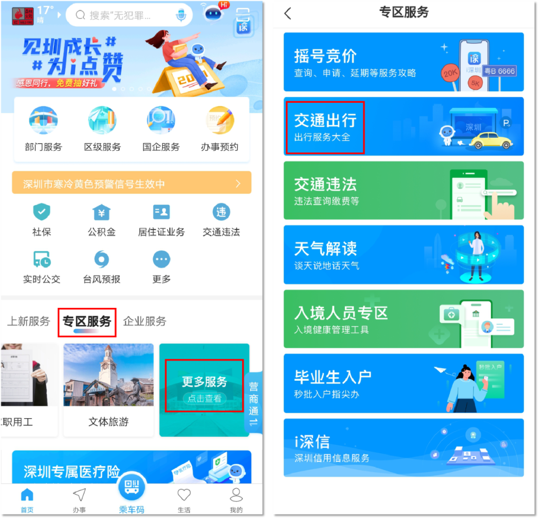 在“i深圳”APP首页点击“专区服务”-“更多服务”