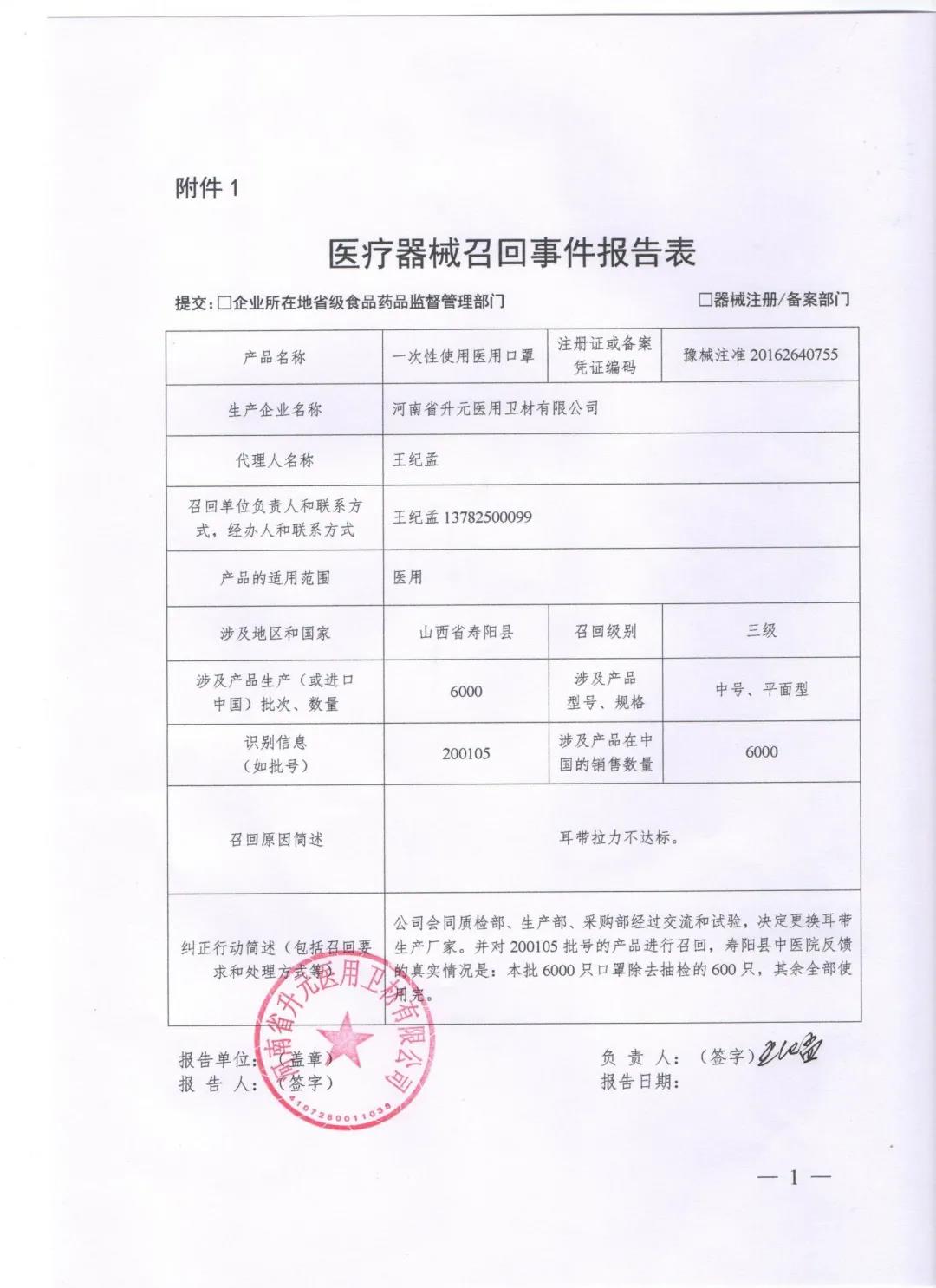 2.河南省升元医用卫材有限公司对一次性使用医用口罩主动召回
