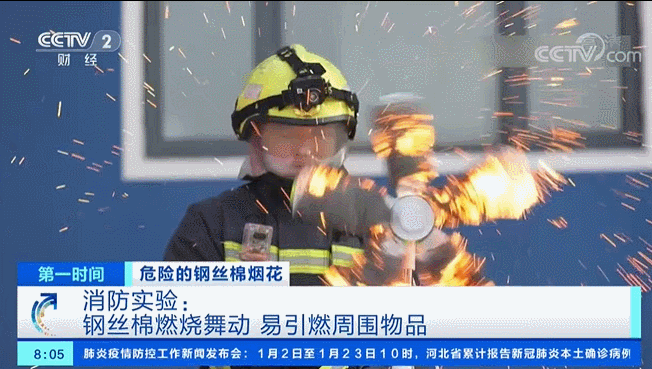 北京大兴区消防救援支队旧宫特勤站副政治指导员 魏建新:特别是在大风天气,还有在闹市以及公园里,我们如果使用或者尝试钢丝棉烟花,很容易引燃周边的可燃物,除此之外也不建议大家去储存钢丝棉,因为它接触高温日晒,以及电池、电源很容易被引燃,从而造成火灾危害。