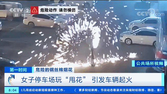 此前,上海一名男子在车顶玩“钢丝棉烟花”,产生的火花致使两辆汽车遭了殃。而最近,多家媒体还报道了另外一起类似事故,在浙江台州,一名女子为拍视频,在停车场用钢丝棉玩起“甩花”,结果引发车辆起火。