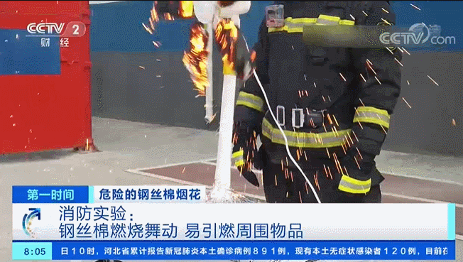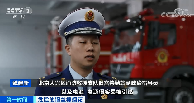 北京大兴区消防救援支队旧宫特勤站副政治指导员 魏建新:特别是在大风天气,还有在闹市以及公园里,我们如果使用或者尝试钢丝棉烟花,很容易引燃周边的可燃物,除此之外也不建议大家去储存钢丝棉,因为它接触高温日晒,以及电池、电源很容易被引燃,从而造成火灾危害。