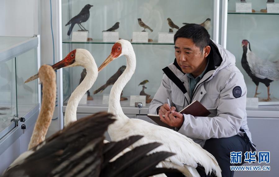 在江西省野生动植物救护繁育中心,汪志如在研究白鹤标本(1月18日摄)。