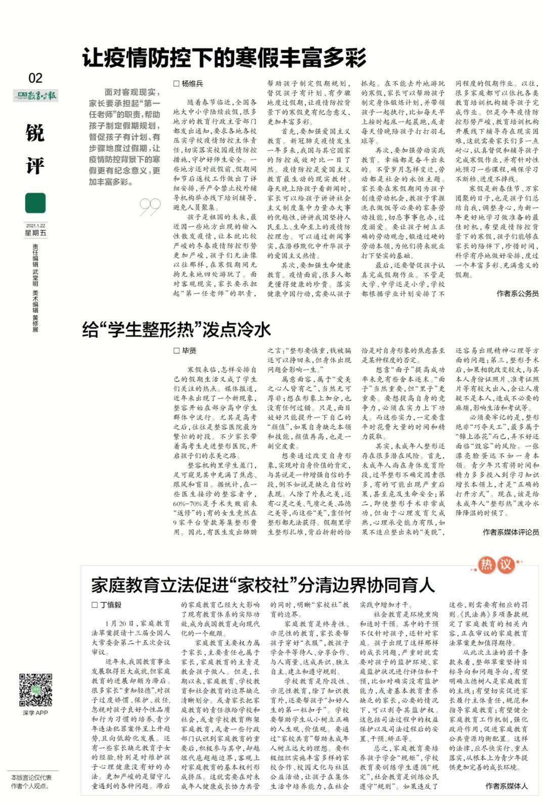 寒假是新春佳节、万家团聚的日子,也是孩子们总结自我,调整身心,为新一年更好地学习做准备的最佳时机,希望疫情防控背景下的寒假,孩子们能够在家长的陪伴下,珍惜时间,科学有序地做好安排,度过一个丰富多彩、充满意义的假期。