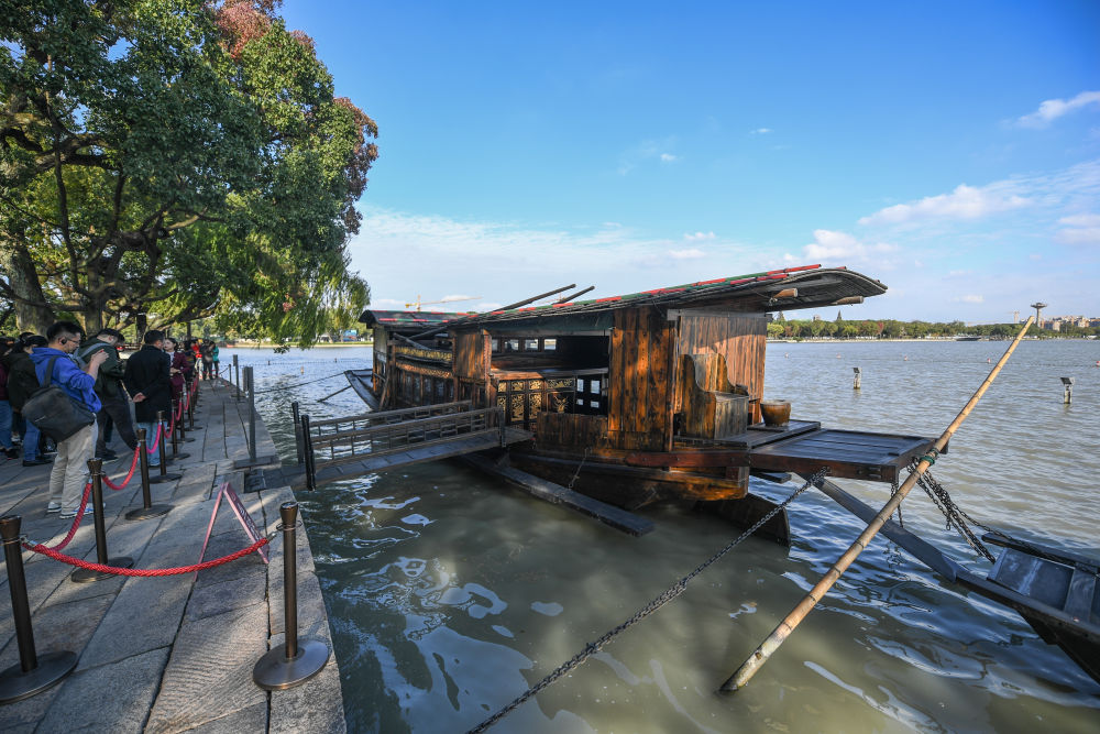 △2020年10月27日拍摄的停靠在嘉兴南湖湖心岛的南湖红船。新华社记者徐昱摄