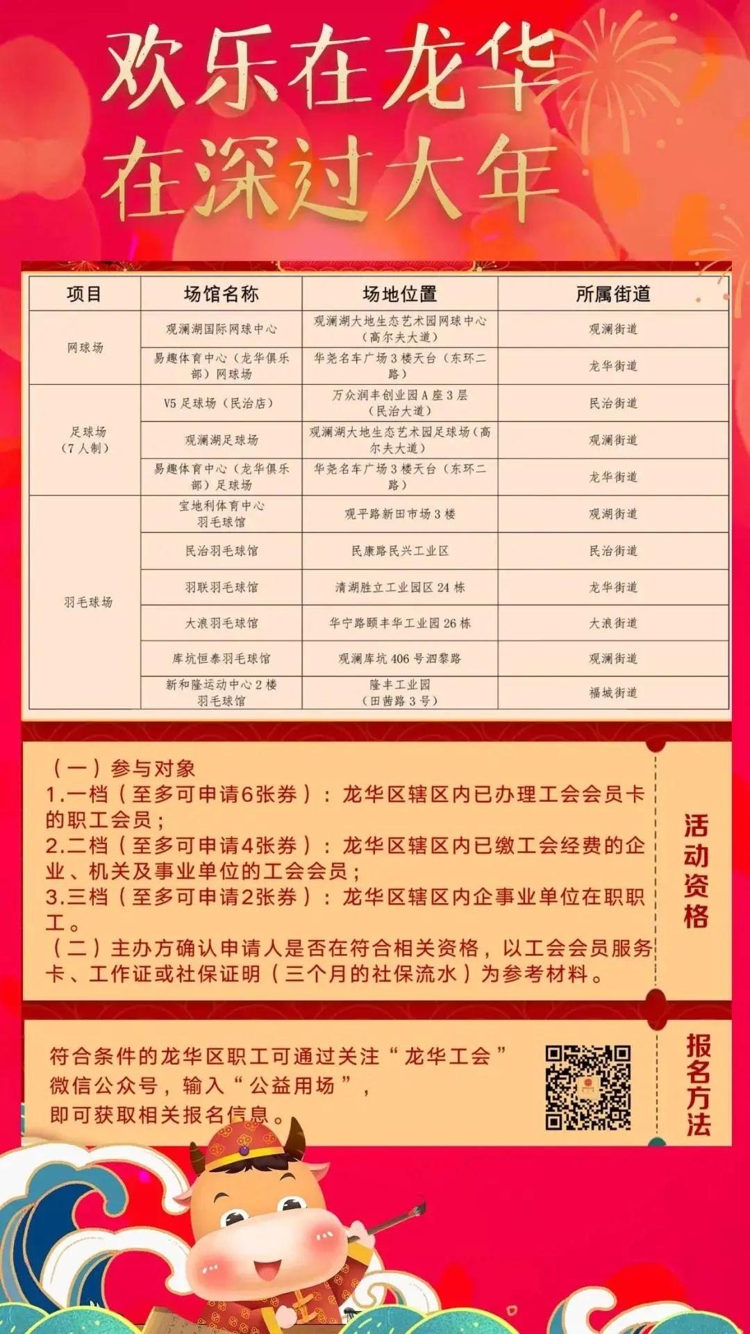 福利到了!“欢乐在龙华·在深过大年”系列之运动场馆免费使用券、电影票大派送,龙华区的职工小伙伴们快来领取吧!