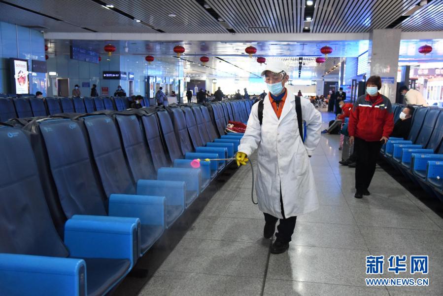 2月1日,济南火车站的工作人员在对候车大厅公共设施进行消杀作业。