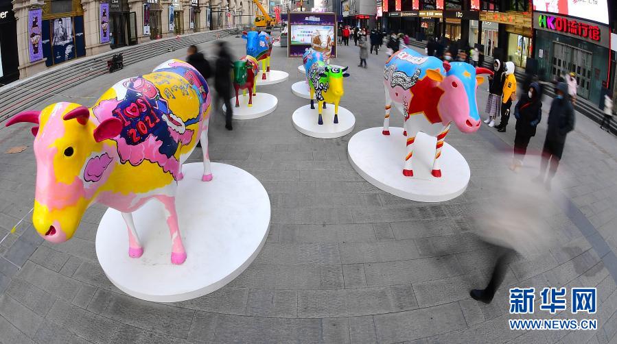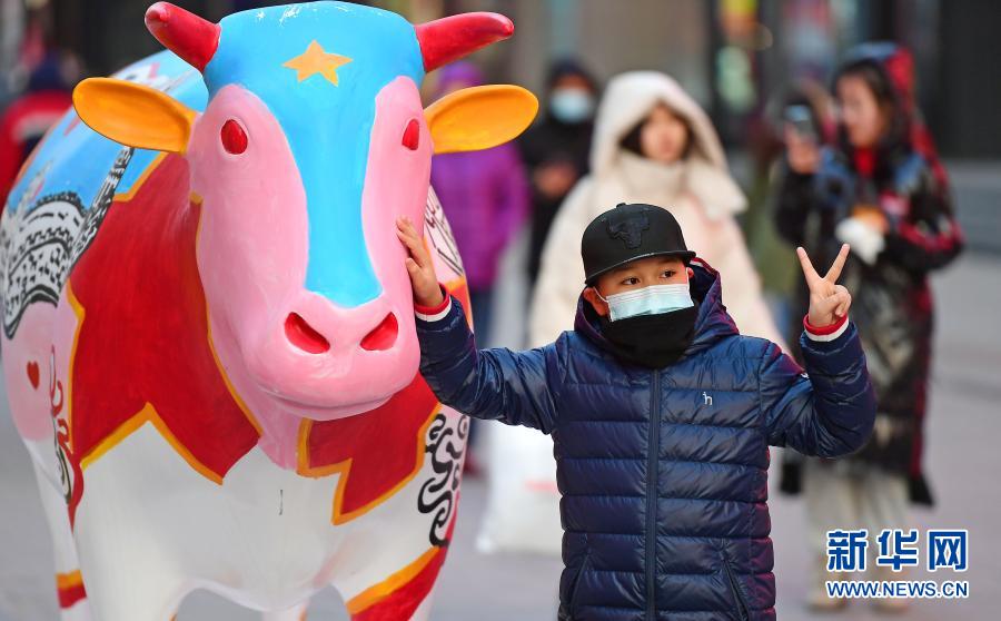 春节临近,年味渐浓,在辽宁沈阳中街步行街,福牛艺术雕塑和各色花灯吸引了众多市民观看拍照。