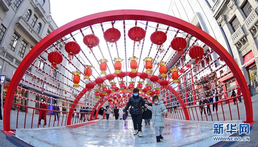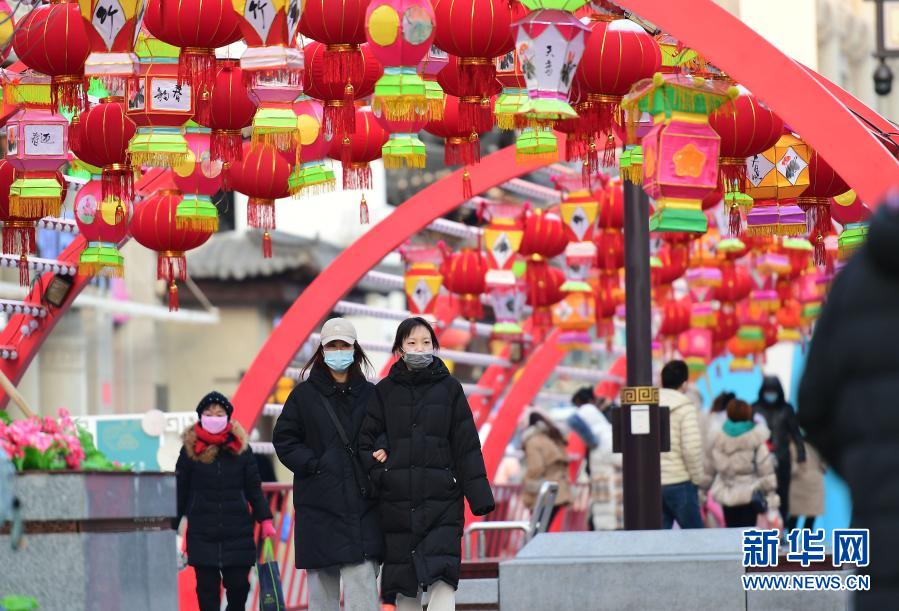 2月1日,在沈阳中街,市民从花灯下走过。