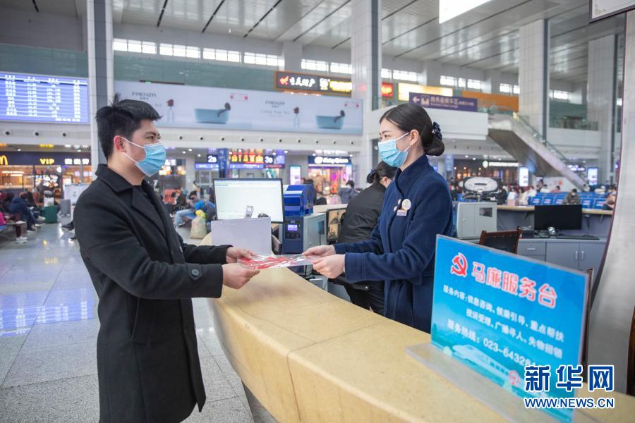 2月1日,在重庆北车站马廉服务台,中国铁路成都局集团有限公司重庆车站的青年员工(右)将剪好的牛年生肖剪纸窗花送给前来问询的旅客。新华社记者黄伟摄