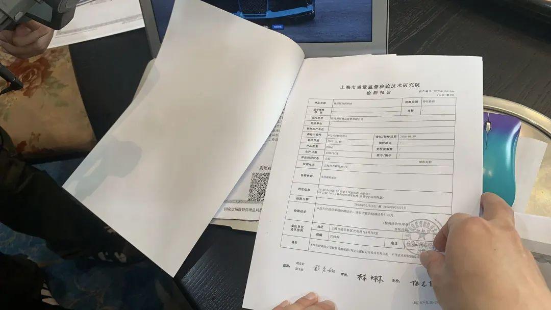 ▲执法人员表示,食用油的检测报告显示为2020年2月,日期超过半年的需要及时更新