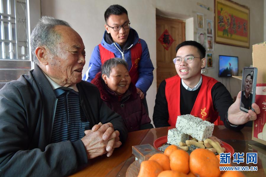 2月3日,在新余市渝水区水北镇泉塘村,当地工作人员看望儿子在广西工作的桂初生、简香秀老俩口,并通过手机视频连线让老人的儿子和他们聊天。新华社记者彭昭之摄