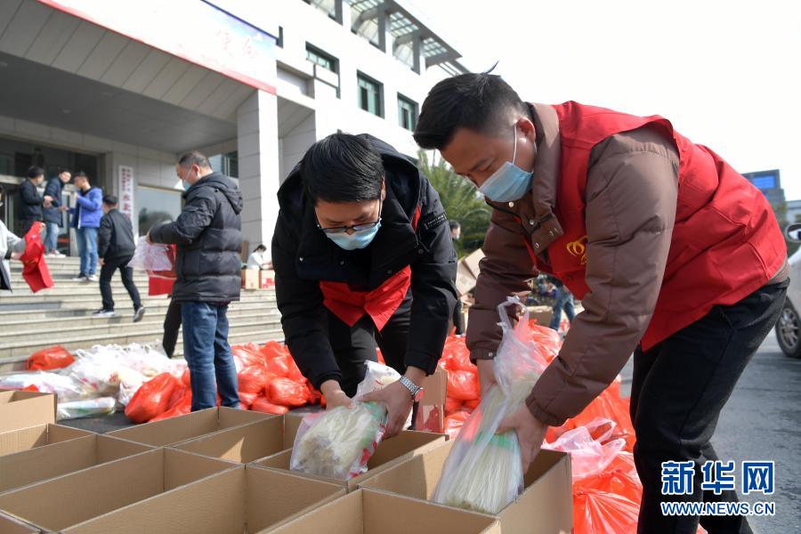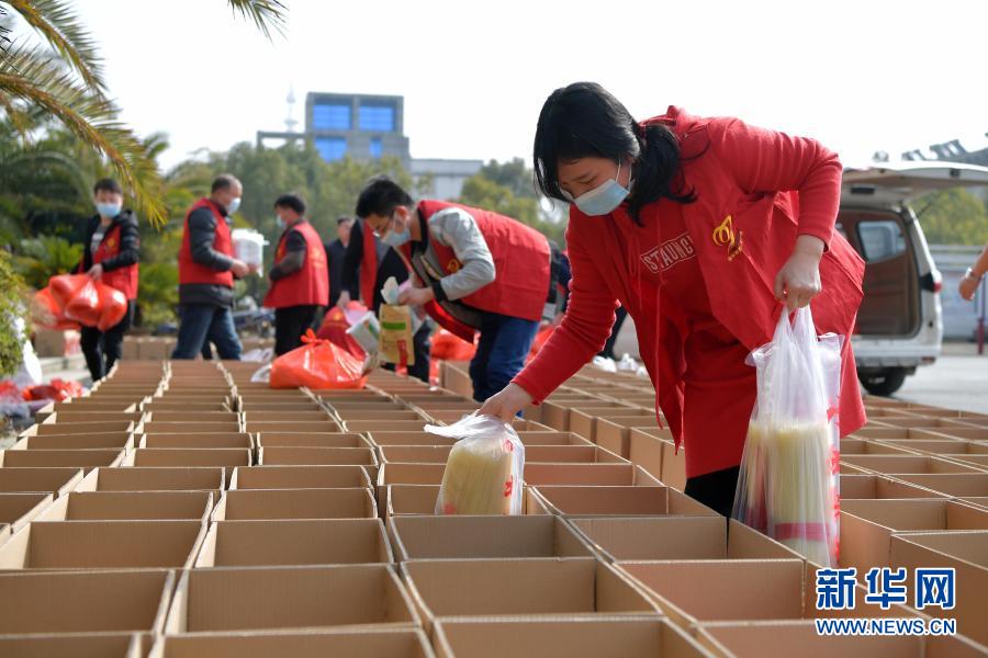2月3日,在新余市渝水区水北镇,当地工作人员为在外就地过年的乡亲准备春节年货大礼包。新华社记者彭昭之摄