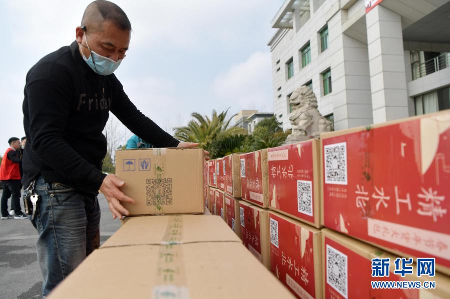 2月3日,在新余市渝水区水北镇,工作人员在搬运春节年货大礼包,准备装车。新华社记者彭昭之摄