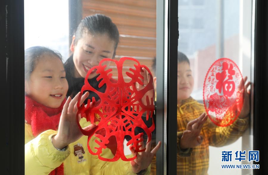 2月3日,志愿者和孩子们一起贴窗花。新华社记者曹力摄