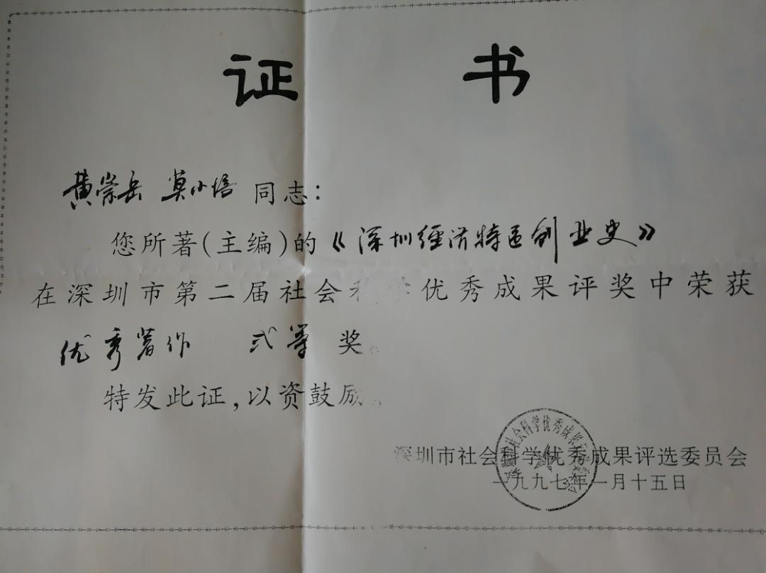 经过几年的努力,1995年《深圳经济特区创业史》由人民出版社正式出版发行,并获得了深圳市社会科学优秀成果二等奖。“过了这么多年,回过头想还是很激动。”莫小培说,“改革开放的浪潮把我们推向了书写历史的风口浪尖,当代人写当代史,很多人都佩服我们,其实也没什么,就是敢作为,敢作为敢担当才能成大事。”