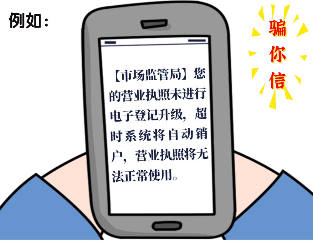 骗子发送一串陌生号码短信,伪装“市场监管局”,以“营业执照需要及时进行电子升级,延时将自动撤销使用资格”为由,让你感到时间紧迫,来不及多想,很容易被骗子牵着鼻子走。