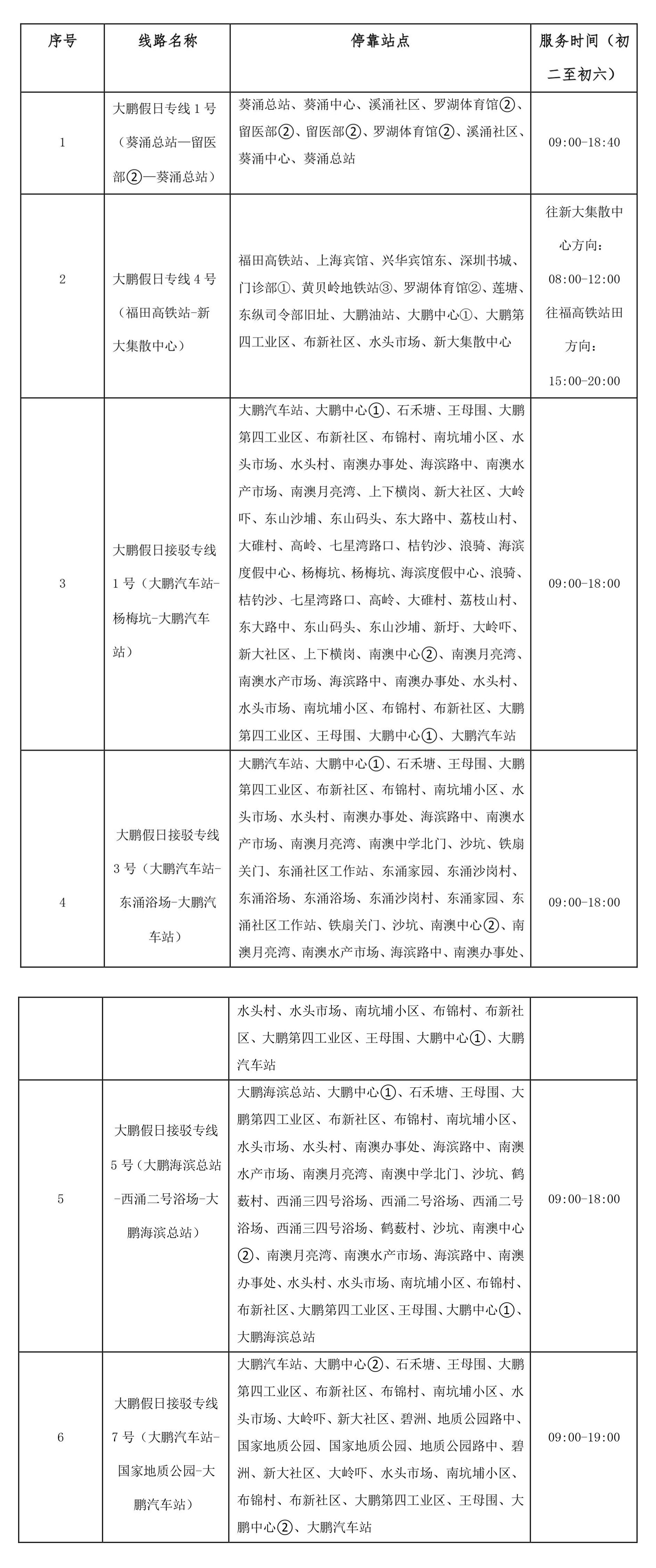 2021年春节期间的2月13日至17日(初二至初六),大鹏新区将开行6条大鹏假日公交线路,其中2条为大鹏假日专线,提供远距离客流聚集点往返大鹏的直达服务;4条为假日接驳专线,提供大鹏中心等主要换乘枢纽站点及新大集散中心往返杨梅坑、东西涌、地质公园等景点的穿梭接驳服务,提高大鹏内部游客流转效率。