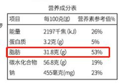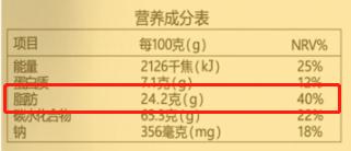 以下面两款不同品牌的果蔬脆片为例,脂肪含量分别是24.2g/100g和31.8g/100g,这是什么概念呢?《中国居民膳食指南(2016)》推荐,健康成年人每天的烹调油用量不超过25~30g,也就是说,吃小小一包果蔬脆片,油摄入量轻轻松松就超标了。