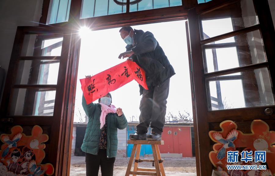 2月5日,滨州市沾化区冯家镇大蔡村村民张金杰夫妇在张贴获赠的春联。