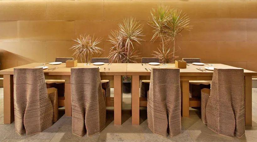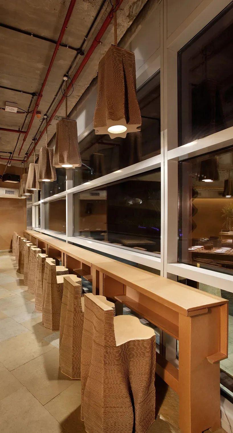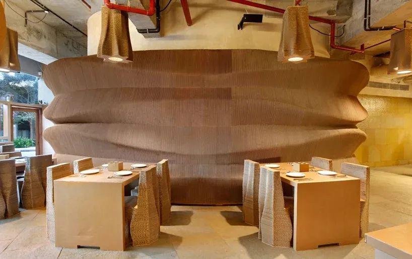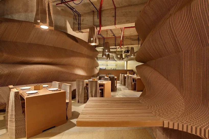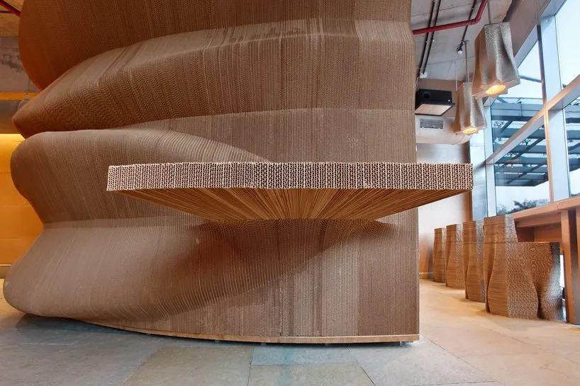 "纸板孟买 "位于孟买的中央商务区,它探索的是 "跳出纸板箱的思维"。建筑师使用100%可回收和生物降解的材料,构建了咖啡馆的内部。