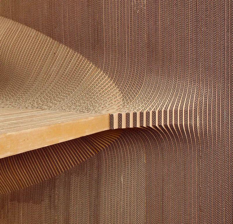 纸板 "微观 "蜿蜒的凹槽与 "宏观 "蜿蜒的自由流动形式之间,存在着强烈的几何关系。错综复杂的图案和纹理,由几何学定律控制的不同角度和弧度的纸板创造而来 。
