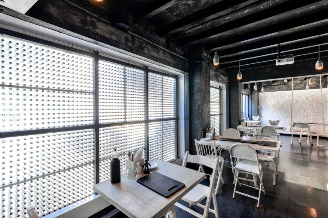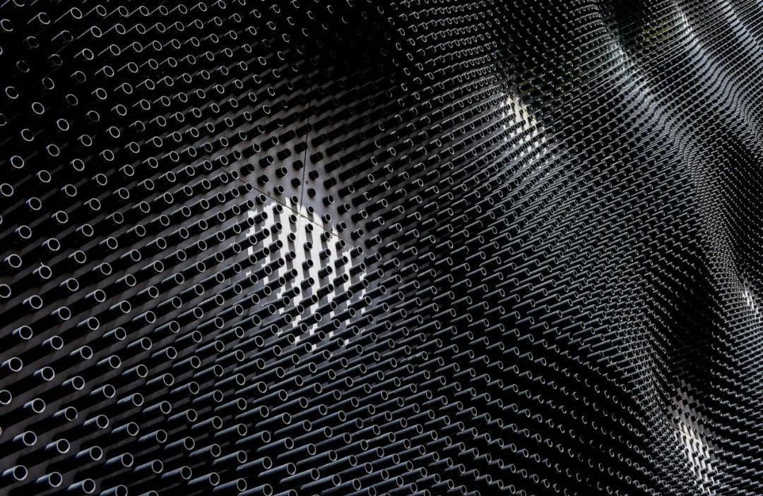 黑色的圆柱形管道被嫁接到数控铝复合板上,完全覆盖建筑物的外观,在咖啡店外创建起一个迷人的、几乎有机的表皮。穿孔设计目的是模拟人体相互作用的各种方式,理解它周围的世界;通过味蕾、头发、手指等。光沿着每一个独立的管道,以不可思议的无拘束创造一个明亮、平静的室内空间。