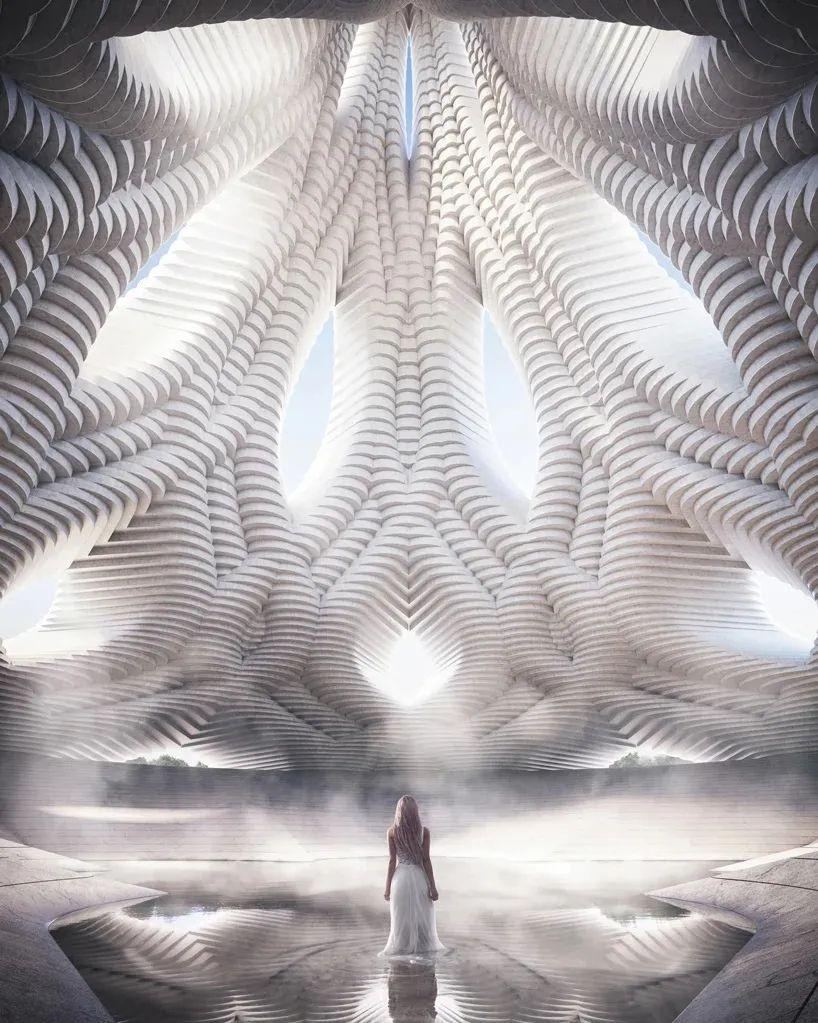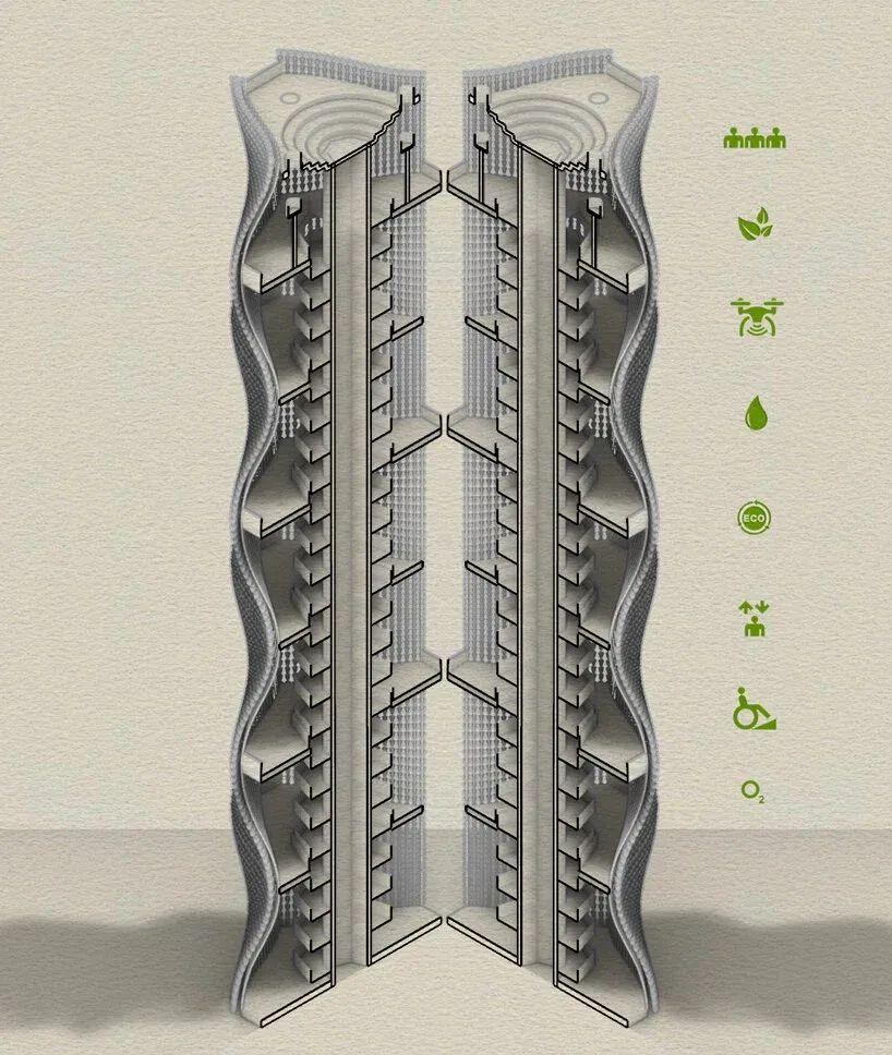 塔的形式是通过算法得出的,通过流动的线条和几何形状,创造出交错的图案,让塔楼成为景观的延伸。设计团队利用尖端的数字设计和优化工具,旨在简化一座建筑从构思到现实的过程,最大限度地减少浪费,并通过使用可持续材料促进对环境的积极影响。