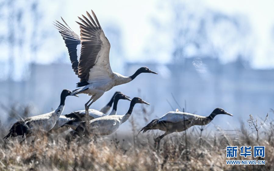 这是2月3日在贵州草海保护区胡叶林核心区拍摄的越冬黑颈鹤。新华社记者杨文斌摄