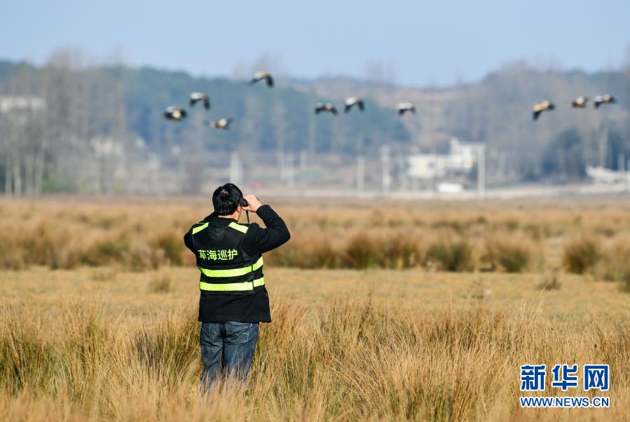 2月3日,管护员马敏店在草海温家屯候鸟夜栖息地观测候鸟活动情况。新华社记者杨文斌摄