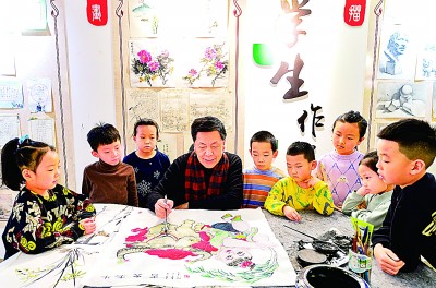 内蒙古呼和浩特市赛罕区万达社区文化室,书画爱好者(中)为小朋友讲解年画故事。新华社发