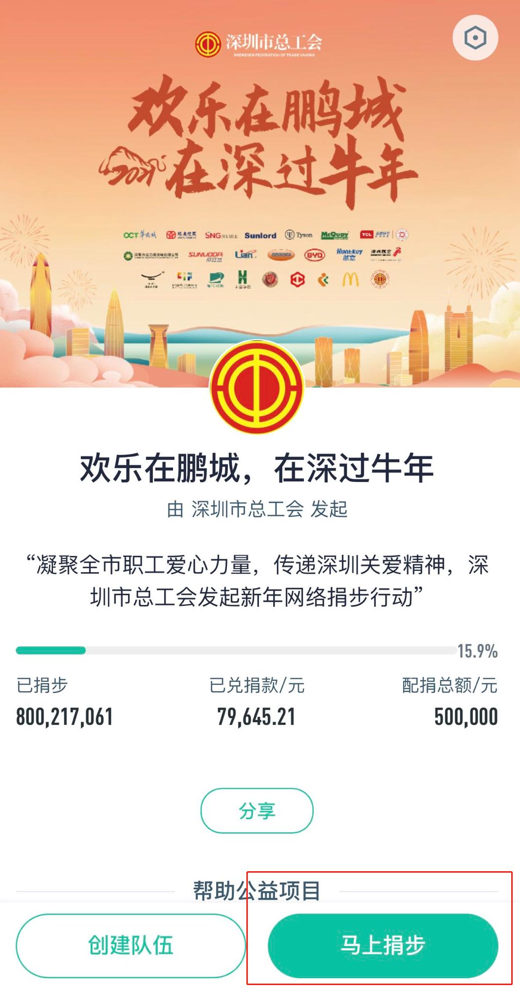 送健康公益捐步活动是深圳市总工会“欢乐在鹏城·在深过牛年”系列活动之一,是市总工会依托腾讯公益平台,联合爱心企业为活动提供50万元捐步配捐资金,即参与活动的职工每捐出一万步,爱心企业将配捐1元(爱心金额以捐步职工名义捐出),最终获得的配捐资金将用于“深工有爱 温暖救助”关爱行动项目帮扶困难职工。