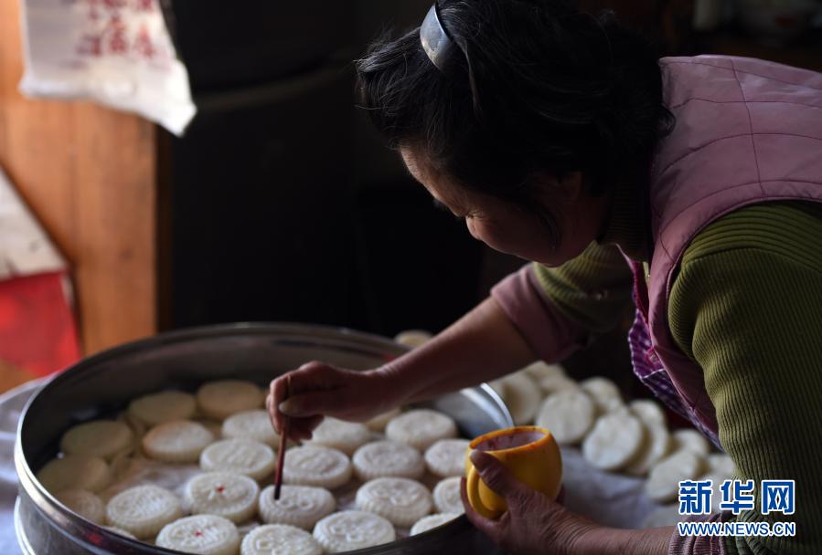 2月6日,按传统春节习俗,安徽省宣城市泾县查济村的村民在刚做好的米粿上“点胭脂”。新华社记者周牧摄