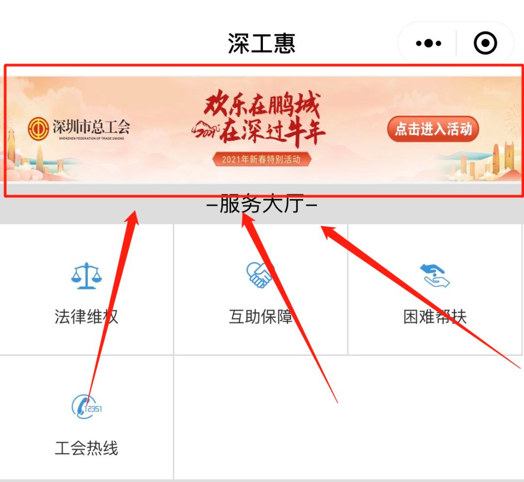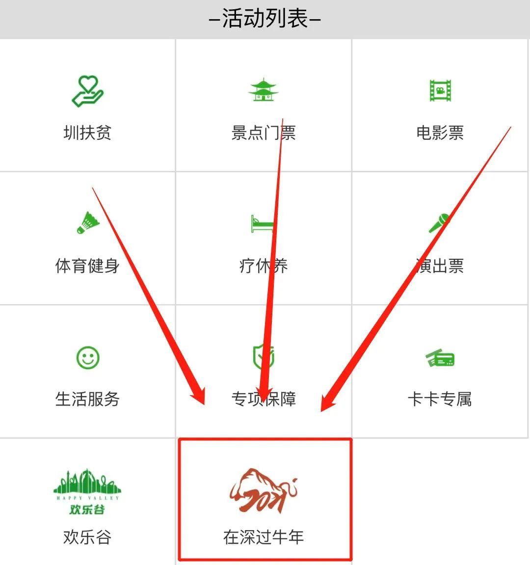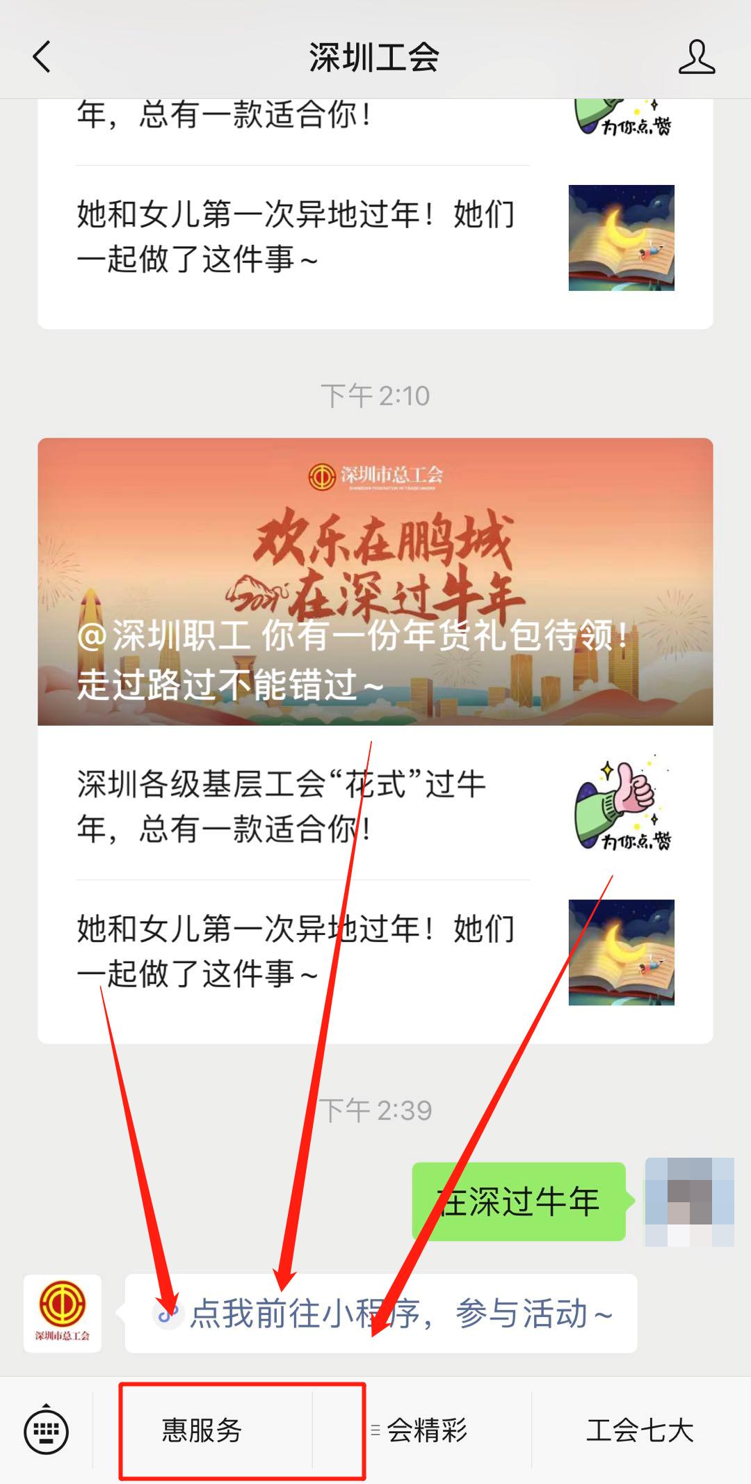进入“深圳工会”公众号,点击菜单栏“惠服务”,进入“在深过牛年”界面