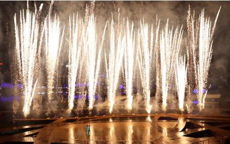 喷泉与烟花共舞,气势恢宏,蔚为壮丽。