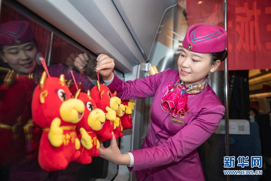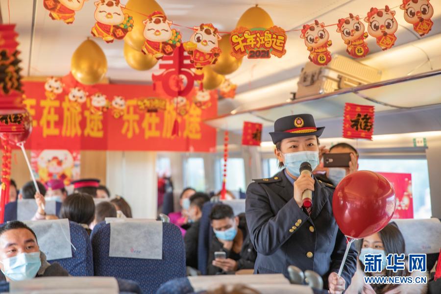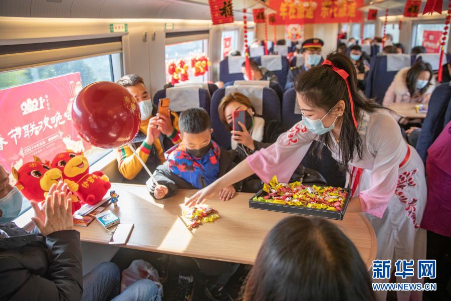 新年临近,中国铁路成都局集团有限公司重庆客运段联合重庆铁路公安处组织青年志愿者,将万州北开往重庆北的C6409次列车装扮一新,为旅客带来一场自编自演的别样“高铁春晚”,让奔波的旅客多了归途的快乐,在旅途中体验别样“年味”。