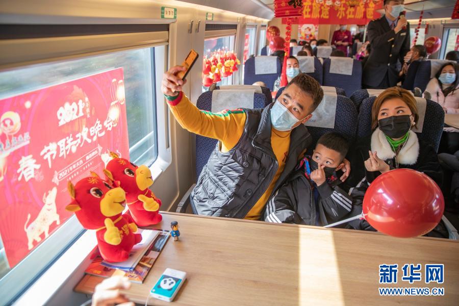 2月9日,在万州北开往重庆北的C6409次列车上,一家三口在装扮有春节元素的车厢内拍照。新华社记者黄伟摄