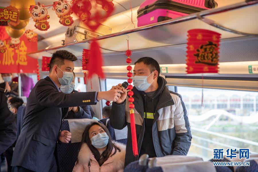 2月9日,在万州北开往重庆北的C6409次列车上,志愿者为旅客进行歌唱表演时与旅客互动。新华社记者黄伟摄