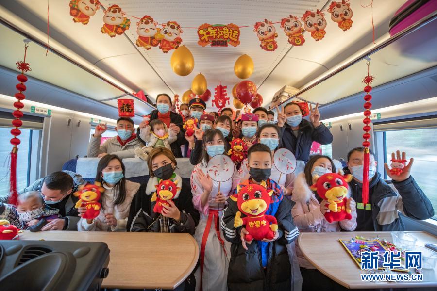 2月9日,在万州北开往重庆北的C6409次列车上,志愿者在表演结束后与旅客合影。新华社记者黄伟摄