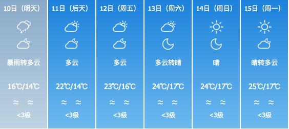 10日凌晨至上午有大雨局部暴雨,伴零散雷暴和8-9级东南阵风,午后降雨减弱,气温14-17℃,体感阴凉;